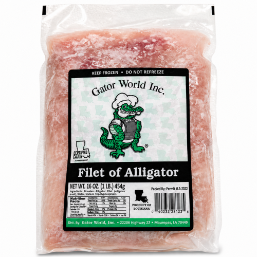 Ingredients Boneless alligator fillet (alligator meat), water, sodium tripolyphosphate.