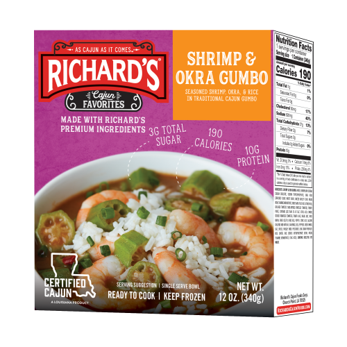 Shrimp & Okra gumbo is a staple in Louisiana. Richard's Shrimp & Okra Gumbo is made with onions, bell peppers, and fresh Louisiana shrimp and okra. No mess, no hassle. ALREADY COOKED. Ready to serve in less than 10 minutes. Serve over steamed rice.